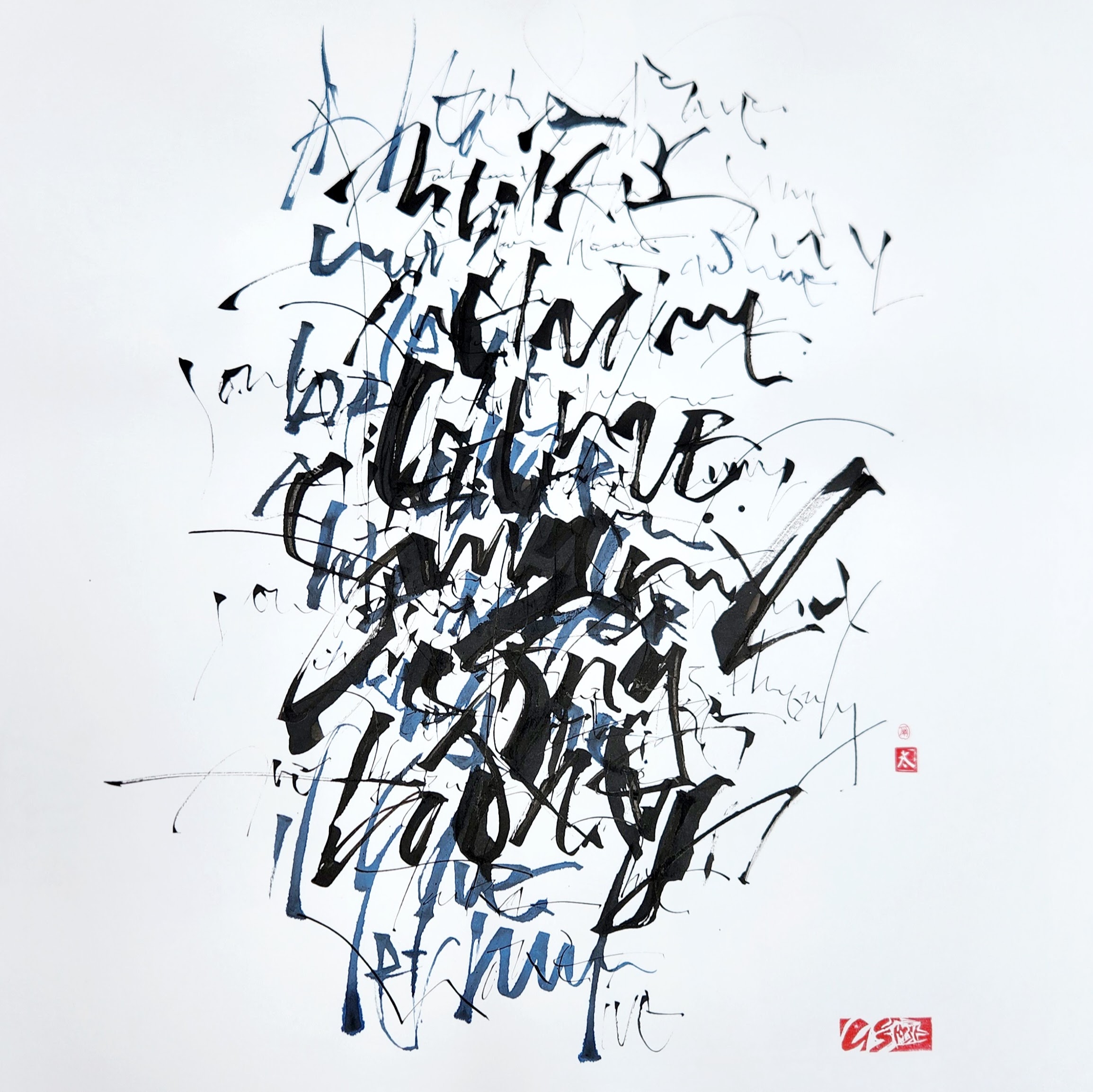 Using both positive and negative shapes equally, the images that evolve form the overlapping design of my works. Applying my calligraphic skill in letterforms, I use balance and colour to interpret the mood of the words.